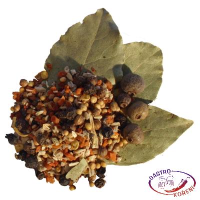 HOŘČICE bílá celá, karotka sušená granulovaná, cibule sušená granulovaná, pepř černý celý, nové koření drcené, chilli drcené, pastińák sušený granulovaný, koriandr, bobkový list. Může obsahovat stopy lepku, celeru a sezamu.