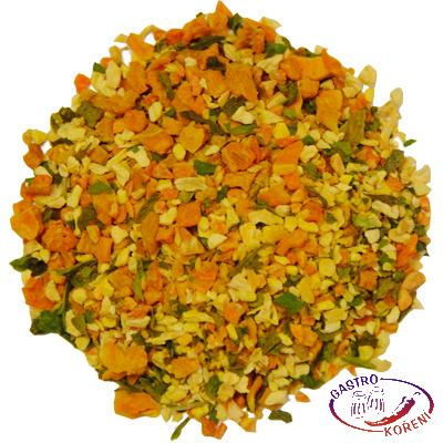 Směs sušené zeleniny v proměnlivých hmotnostních podílech (mrkev, cibule, petržel, CELER, libeček), kurkuma. Může obsahovat stopy celeru, hořčice a sezamu.