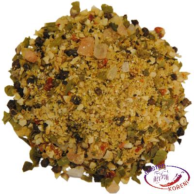 Sůl himalájská hrubá (max. 15%), česnek sušený, sušené pivovarské kvasnice, pepř černý, kukuřičná krupice, sůl mořská hrubá (max. 5%), kmín římský, sušená kapie, medvědí česnek. Může obsahovat stopy celeru, hořčice a sezamu.