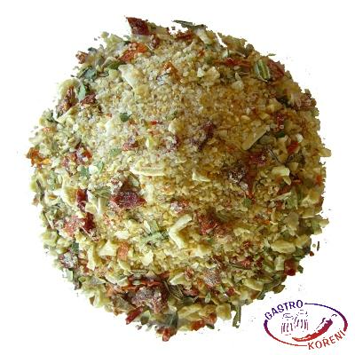 Sůl max.28%, česnek, cibule, paprika, kapie, oregano, pepř bílý, kopr, medvědí česnek. Může obsahovat stopy celeru, hořčice a sezamu.