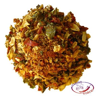 Sůl jemná (max 14%), koření (koriandr, chilli, paprika, pastinák, cibule, pepř) zvýrazňovač chuti E 621. Může obsahovat stopy celeru, hořčice a sezamu.