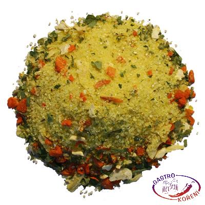 Sůl (max.62%), cukr, kukuřičná mouka, sušená zelenina (karotka, petržel, CELER, cibule, česnek), pepř černý mletý, kurkuma, barvivo riboflavin, vláknina. Může obsahovat stopy celeru, hořčice a sezamu.